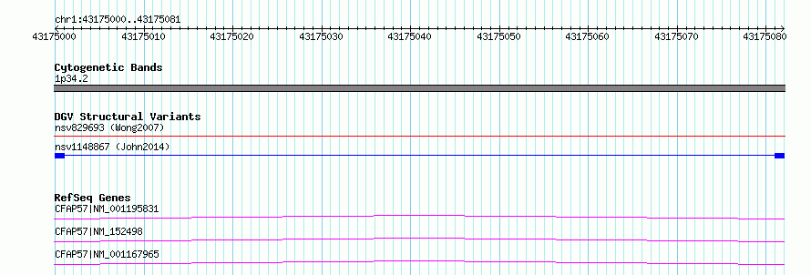 Variant DetailsVariant: nsv1148867| Internal ID | 18855880 | | Landmark | | | Location Information | | | Cytoband | 1p34.2 | | Allele length | | Assembly | Allele length | | hg38 | 82 | | hg19 | 82 |