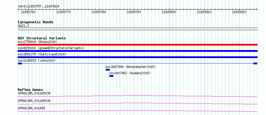 Variant DetailsVariant: nsv1149933Internal ID | 18853824 | Landmark | | Location Information | | Cytoband | 8p21.3 | Allele length | Assembly | Allele length | hg38 | 68 | hg19 | 68 |