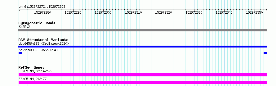 Variant DetailsVariant: nsv1150330| Internal ID | 19200850 | | Landmark | | | Location Information | | | Cytoband | 6q25.2 | | Allele length | | Assembly | Allele length | | hg38 | 82 | | hg19 | 82 |