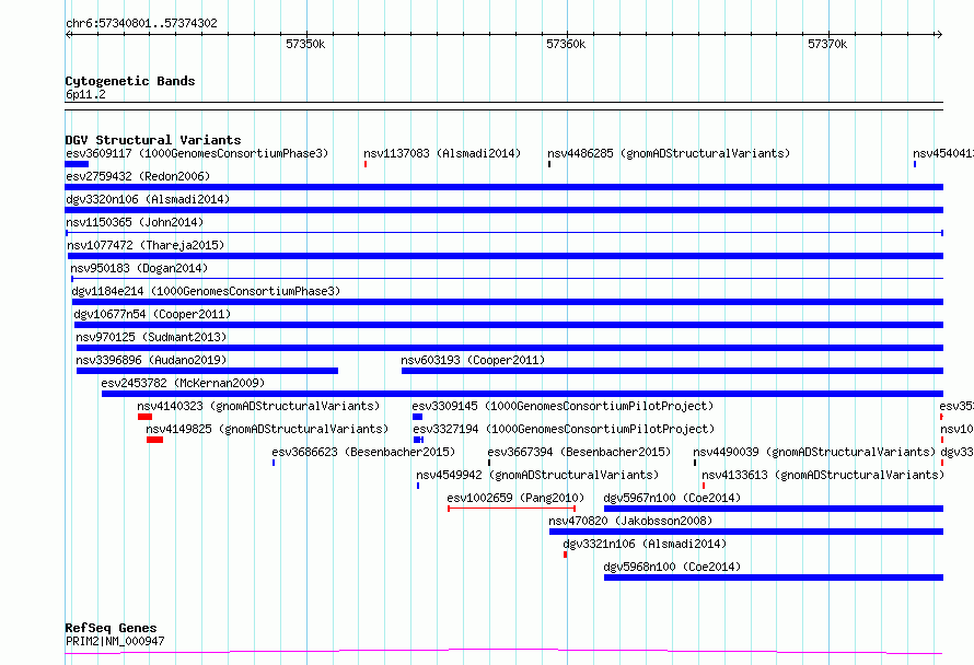 | Variant Type | CNV duplication | Copy Number | | Allele State | | Allele Origin | | Probe Count | | Validation Flag | | Merged Status | M | Merged Variants | | Supporting Variants | nssv4003666 | Samples | KWB1 | Known Genes | PRIM2 | Method | Sequencing | Analysis | HugeSeq | Platform | Illumina HiSeq 2000 | Comments | | Reference | John_et_al_2014 | Pubmed ID | 26484159 | Accession Number(s) | nsv1150365