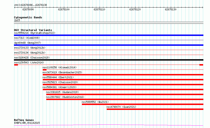 Variant DetailsVariant: nsv1150543| Internal ID | 19197230 | | Landmark | | | Location Information | | | Cytoband | 2p15 | | Allele length | | Assembly | Allele length | | hg38 | 53 | | hg19 | 53 |