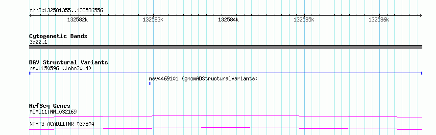 | | Variant Type | CNV duplication | | Copy Number | | | Allele State | | | Allele Origin | | | Probe Count | | | Validation Flag | | | Merged Status | M | | Merged Variants | | | Supporting Variants | nssv3996071 | | Samples | KWB1 | | Known Genes | ACAD11, NPHP3-ACAD11 | | Method | Sequencing | | Analysis | HugeSeq | | Platform | Illumina HiSeq 2000 | | Comments | | | Reference | John_et_al_2014 | | Pubmed ID | 26484159 | | Accession Number(s) | nsv1150596