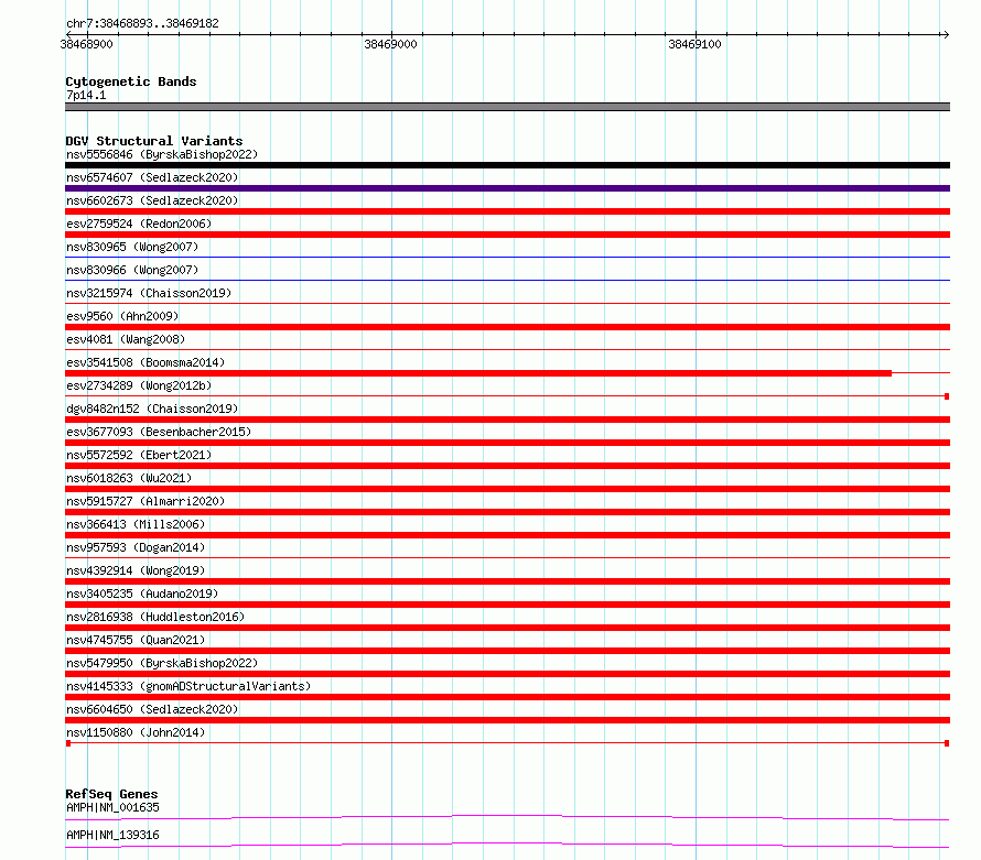 Variant DetailsVariant: nsv1150880| Internal ID | 19198441 | | Landmark | | | Location Information | | | Cytoband | 7p14.1 | | Allele length | | Assembly | Allele length | | hg38 | 290 | | hg19 | 290 |