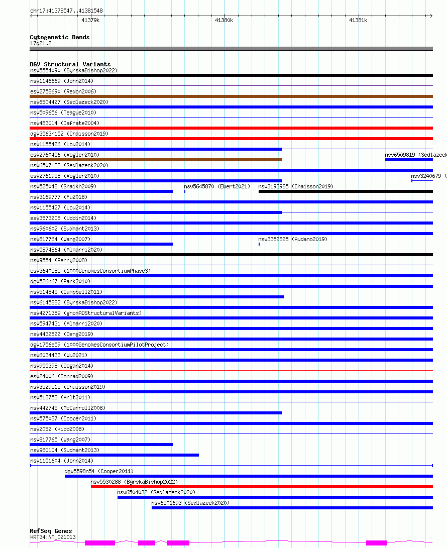 Variant DetailsVariant: nsv1151604| Internal ID | 19199107 | | Landmark | | | Location Information | | | Cytoband | 17q21.2 | | Allele length | | Assembly | Allele length | | hg38 | 3002 | | hg19 | 3002 |