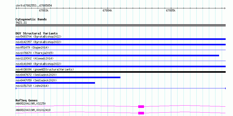 Variant DetailsVariant: nsv1151719| Internal ID | 19202810 | | Landmark | | | Location Information | | | Cytoband | 9q13 | | Allele length | | Assembly | Allele length | | hg38 | 3302 | | hg19 | 3302 |