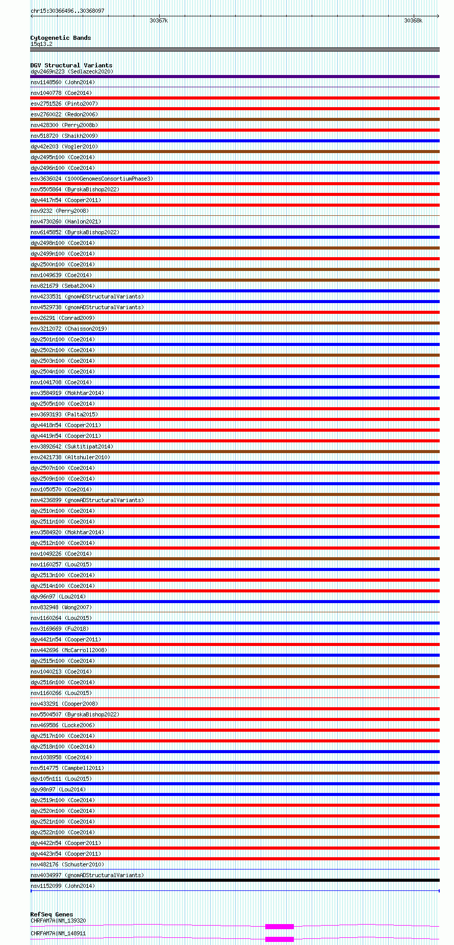 Variant DetailsVariant: nsv1152099| Internal ID | 19197686 | | Landmark | | | Location Information | | | Cytoband | 15q13.2 | | Allele length | | Assembly | Allele length | | hg38 | 1602 | | hg19 | 1602 |