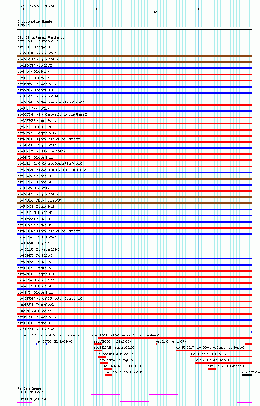 Variant DetailsVariant: nsv1152112| Internal ID | 18853955 | | Landmark | | | Location Information | | | Cytoband | 1p36.33 | | Allele length | | Assembly | Allele length | | hg38 | 1602 | | hg19 | 1602 |