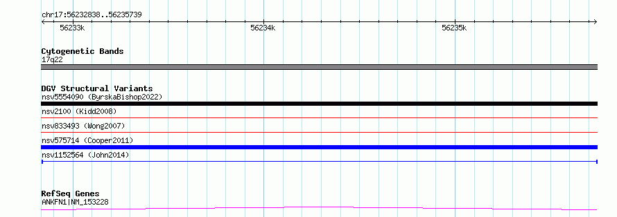 Variant DetailsVariant: nsv1152564| Internal ID | 19199974 | | Landmark | | | Location Information | | | Cytoband | 17q22 | | Allele length | | Assembly | Allele length | | hg38 | 2902 | | hg19 | 2902 |