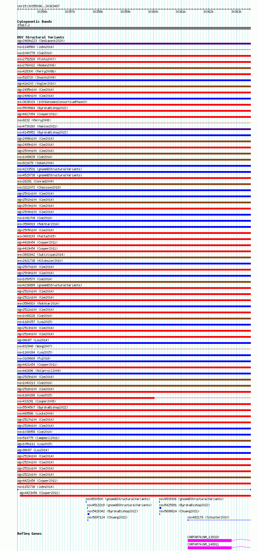 Variant DetailsVariant: nsv1152738| Internal ID | 19203195 | | Landmark | | | Location Information | | | Cytoband | 15q13.2 | | Allele length | | Assembly | Allele length | | hg38 | 8402 | | hg19 | 8402 |