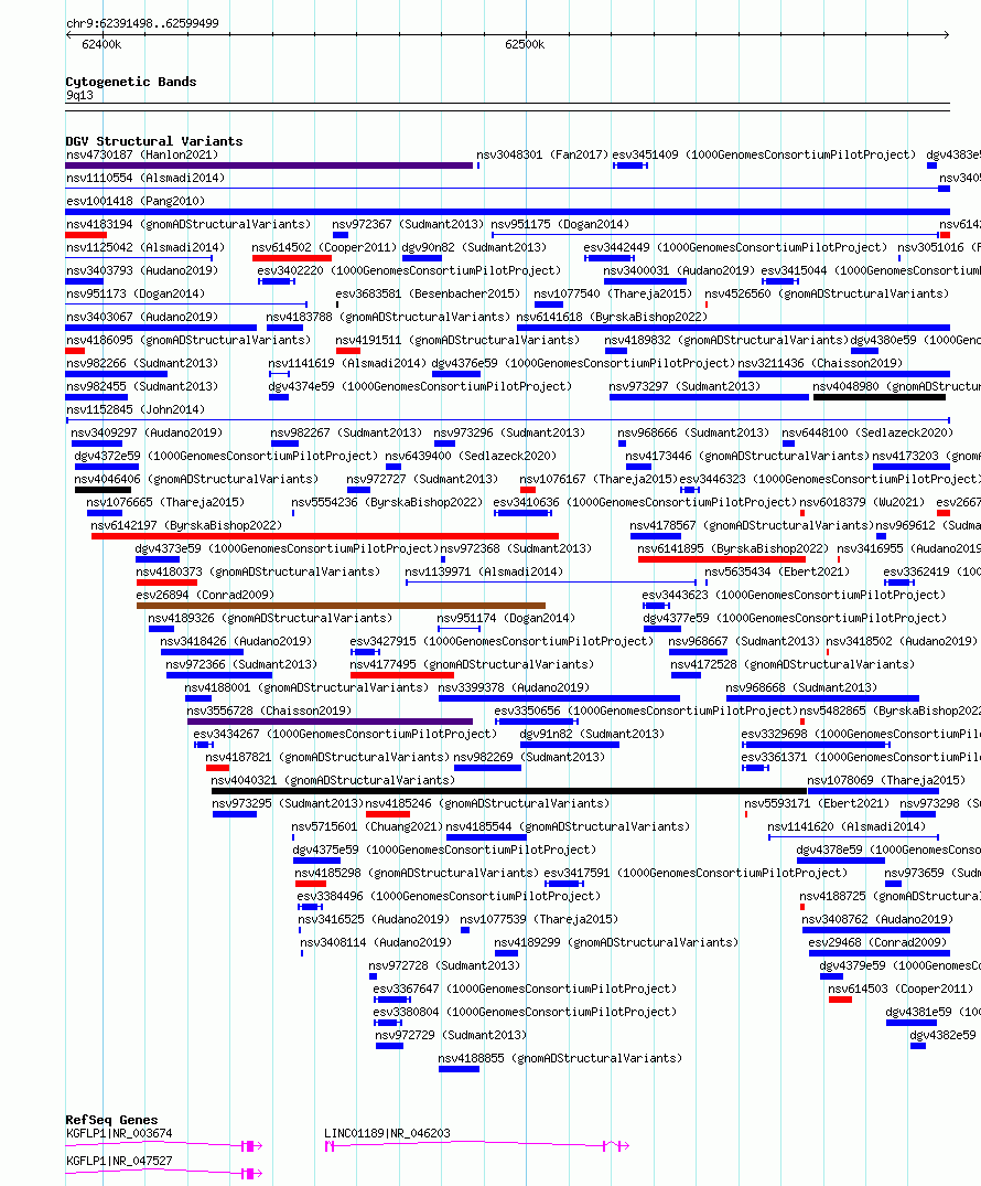 Variant DetailsVariant: nsv1152845| Internal ID | 19201993 | | Landmark | | | Location Information | | | Cytoband | 9p11.2 | | Allele length | | Assembly | Allele length | | hg38 | 208002 | | hg19 | 208002 |