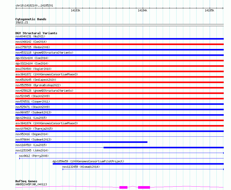 Variant DetailsVariant: nsv1153345| Internal ID | 19203325 | | Landmark | | | Location Information | | | Cytoband | 18p11.21 | | Allele length | | Assembly | Allele length | | hg38 | 3102 | | hg19 | 3102 |