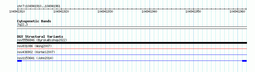 Variant DetailsVariant: nsv1153641| Internal ID | 19199484 | | Landmark | | | Location Information | | | Cytoband | 7q22.3 | | Allele length | | Assembly | Allele length | | hg38 | 52 | | hg19 | 52 |