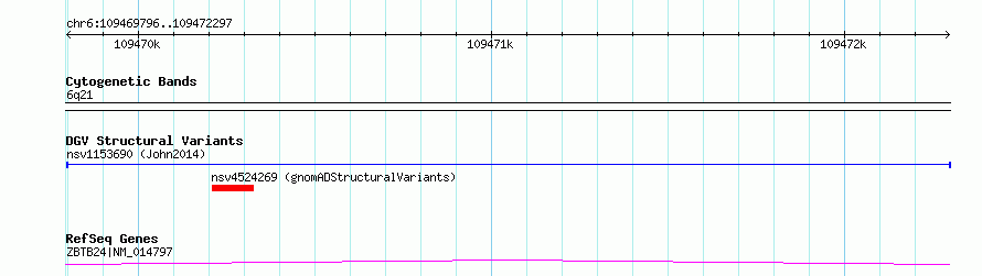 | | Variant Type | CNV duplication | | Copy Number | | | Allele State | | | Allele Origin | | | Probe Count | | | Validation Flag | | | Merged Status | M | | Merged Variants | | | Supporting Variants | nssv4002341 | | Samples | KWB1 | | Known Genes | ZBTB24 | | Method | Sequencing | | Analysis | HugeSeq | | Platform | Illumina HiSeq 2000 | | Comments | | | Reference | John_et_al_2014 | | Pubmed ID | 26484159 | | Accession Number(s) | nsv1153690