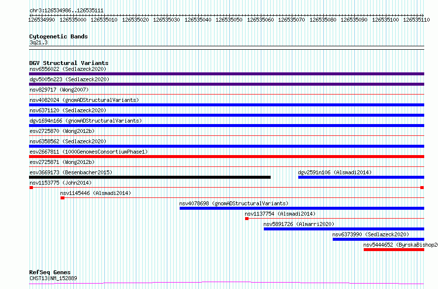 Variant DetailsVariant: nsv1153775| Internal ID | 19199029 | | Landmark | | | Location Information | | | Cytoband | 3q21.3 | | Allele length | | Assembly | Allele length | | hg38 | 126 | | hg19 | 126 |