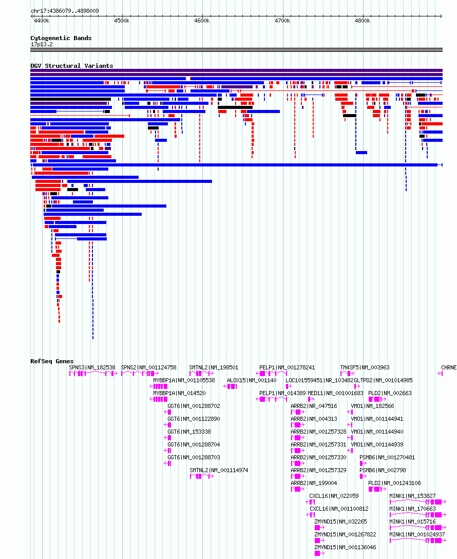 Variant DetailsVariant: nsv1155370| Internal ID | 22085875 | | Landmark | | | Location Information | | | Cytoband | 17p13.2 | | Allele length | | Assembly | Allele length | | hg38 | 511931 | | hg19 | 511931 |
