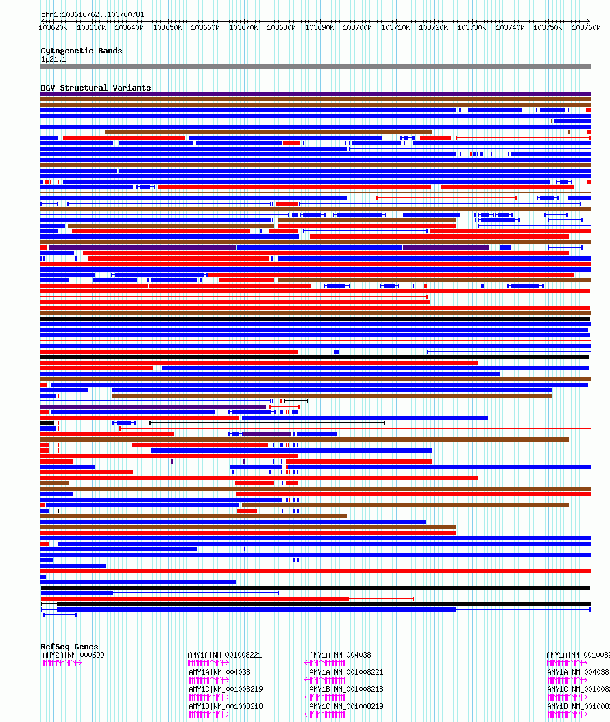 | | Variant Type | CNV duplication | | Copy Number | | | Allele State | | | Allele Origin | | | Probe Count | | | Validation Flag | | | Merged Status | M | | Merged Variants | | | Supporting Variants | nssv4017926 | | Samples | | | Known Genes | AMY1A, AMY1B, AMY1C, AMY2A | | Method | SNP array | | Analysis | Default settings | | Platform | | | Comments | | | Reference | Lou_et_al_2014 | | Pubmed ID | 25026903 | | Accession Number(s) | nsv1156100