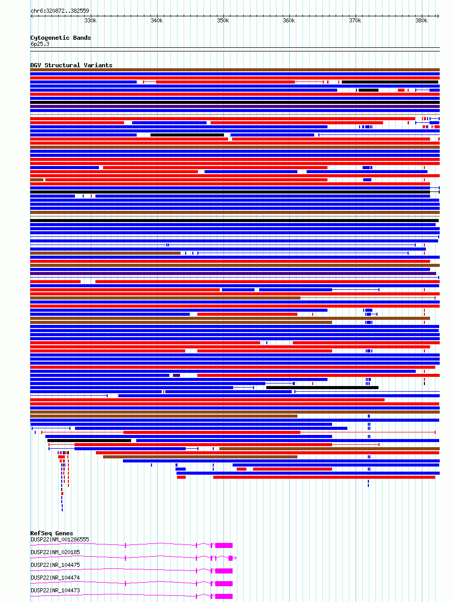 Variant DetailsVariant: nsv1156440| Internal ID | 22086841 | | Landmark | | | Location Information | | | Cytoband | 6p25.3 | | Allele length | | Assembly | Allele length | | hg38 | 61688 | | hg19 | 61688 |