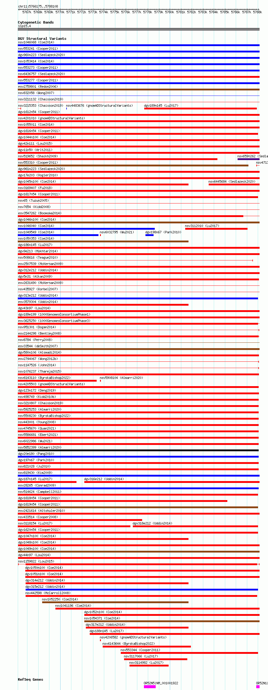 Variant DetailsVariant: nsv1159822 | Internal ID | 19302741 | | Landmark | | | Location Information | | | Cytoband | 11p15.4 | | Allele length | | Assembly | Allele length | | hg38 | 21934 | | hg19 | 21934 |