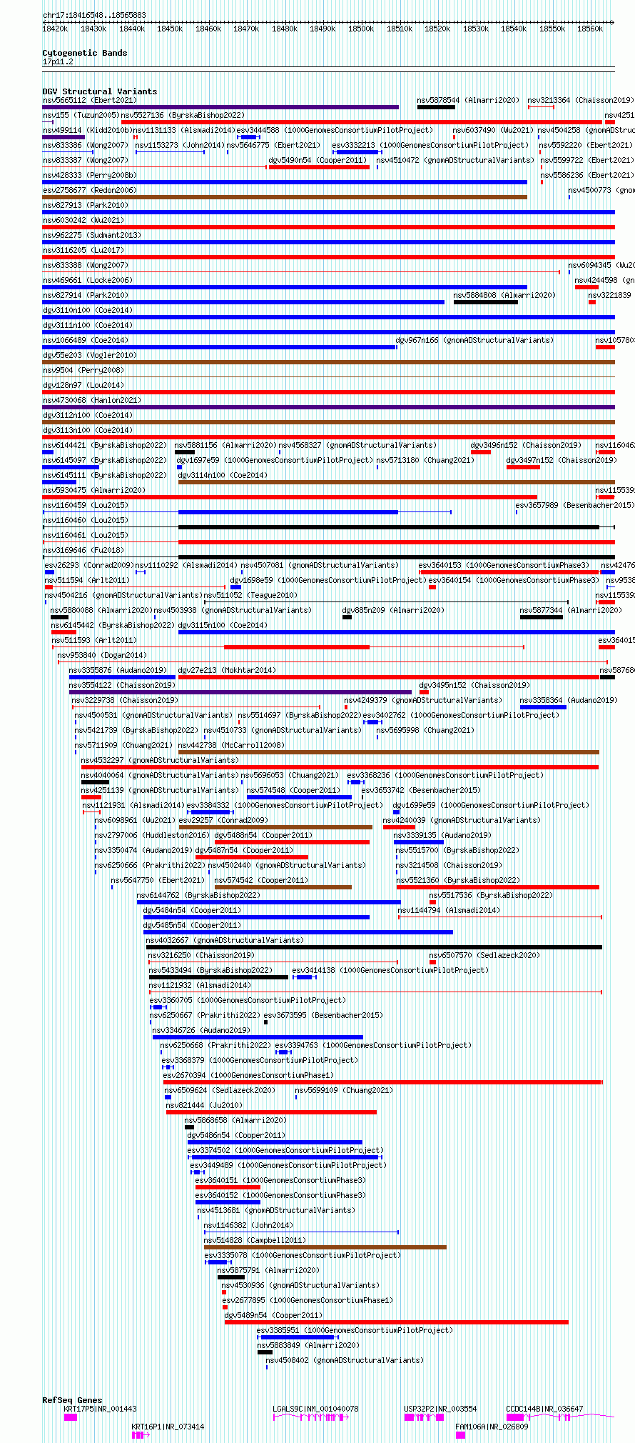 Variant DetailsVariant: nsv1160460 | Internal ID | 19304142 | | Landmark | | | Location Information | | | Cytoband | 17p11.2 | | Allele length | | Assembly | Allele length | | hg38 | 149336 | | hg19 | 149336 |