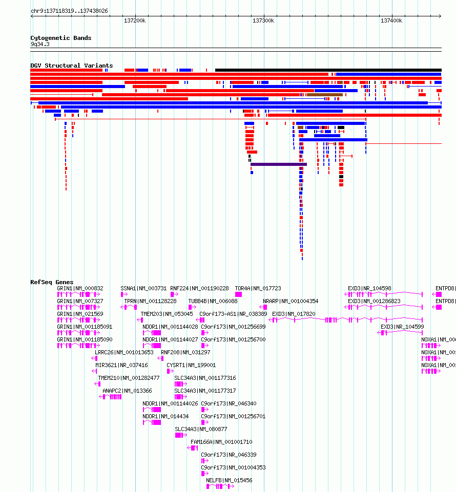 | | Variant Type | CNV duplication | | Copy Number | | | Allele State | | | Allele Origin | | | Probe Count | | | Validation Flag | | | Merged Status | M | | Merged Variants | | | Supporting Variants | nssv4038050 | | Samples | | | Known Genes | ANAPC2, C9orf169, C9orf173, ENTPD8, EXD3, FAM166A, GRIN1, LOC100129722, LRRC26, MIR3621, NDOR1, NELFB, NOXA1, NRARP, RNF208, RNF224, SLC34A3, SSNA1, TMEM203, TMEM210, TOR4A, TPRN, TUBB4B | | Method | SNP array | | Analysis | 1) We applied common software Birdsuite to detect genome-wide CNVs; 2) we used our algorithm WinXPCNVer which is based on probe intensity to identify Tibetan specific CNV; 3) we further genotyped the discovered Tibetan specific CNV by K-means and manual observation. | | Platform | Affymetrix SNP Array 6.0 | | Comments | | | Reference | Lou_et_al_2015 | | Pubmed ID | 26073780 | | Accession Number(s) | nsv1161918