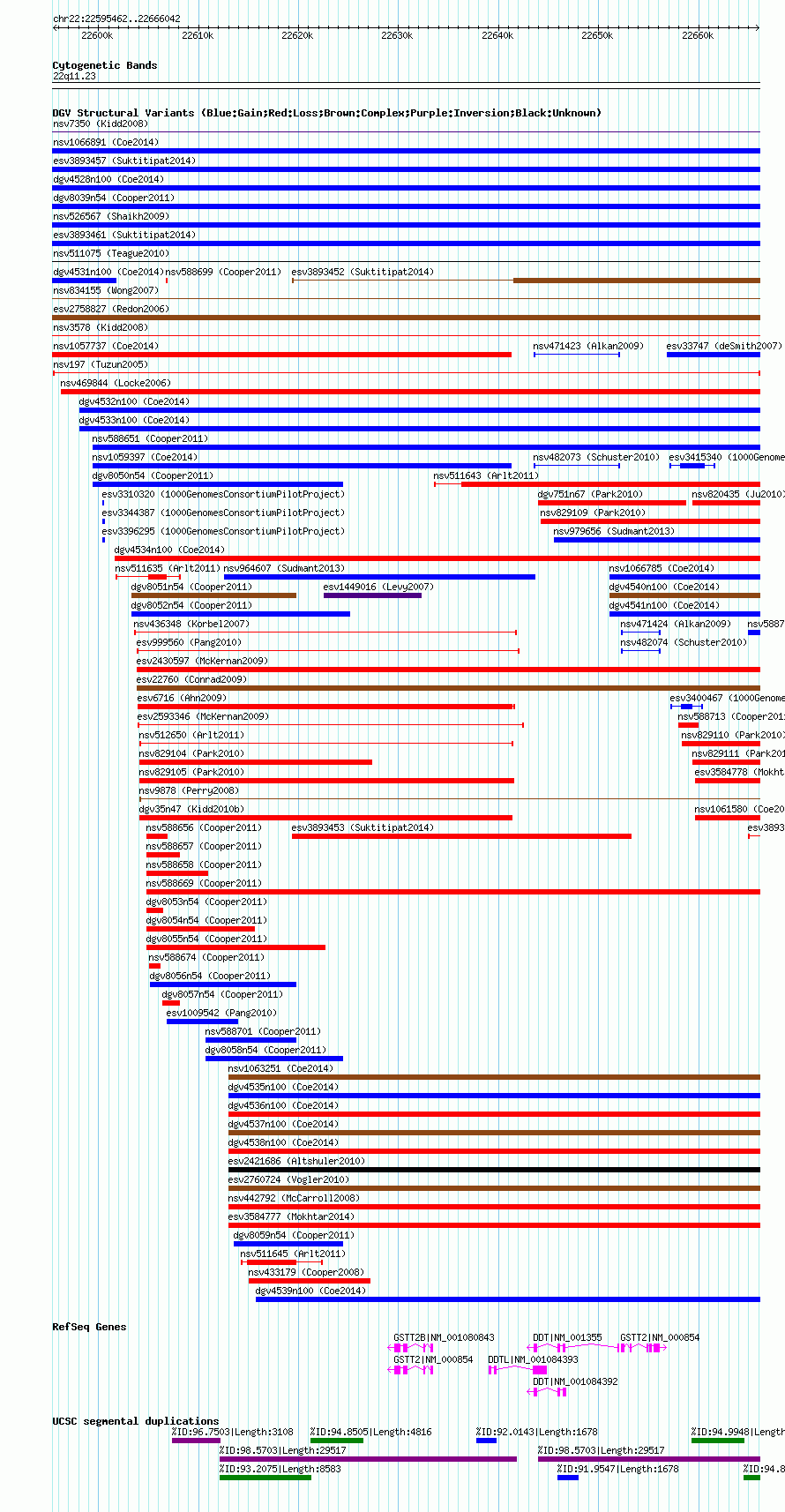 Variant DetailsVariant: nsv197| Internal ID | 15036996 | | Landmark | | | Location Information | | | Cytoband | 22q11.23 | | Allele length | | Assembly | Allele length | | hg38 | 70574 | | hg19 | 70581 | | hg18 | 70581 | | hg17 | 70581 |
