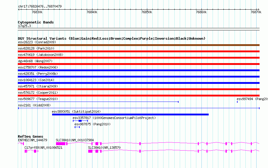 Variant DetailsVariant: nsv2161| Internal ID | 15200038 | | Landmark | | | Location Information | | | Cytoband | 17q25.3 | | Allele length | | Assembly | Allele length | | hg38 | 6200 | | hg19 | 6200 | | hg18 | 6200 | | hg17 | 6200 |
