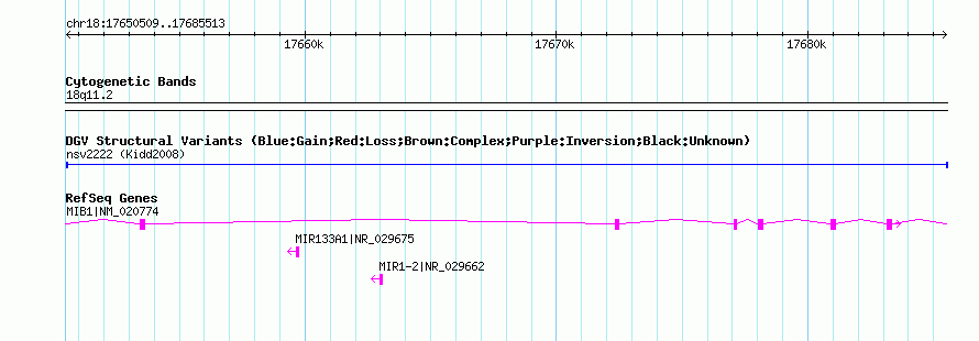 | | Variant Type | CNV insertion | | Copy Number | | | Allele State | | | Allele Origin | | | Probe Count | | | Validation Flag | | | Merged Status | M | | Merged Variants | | | Supporting Variants | nssv1397 | | Samples | NA19240 | | Known Genes | MIB1, MIR1-2, MIR133A1 | | Method | Sequencing | | Analysis | End-sequence pairs were mapped to the human genome assembly (hg17) using a previously described algorithm (Tuzun et al 2005) | | Platform | Capillary | | Comments | | | Reference | Kidd_et_al_2008 | | Pubmed ID | 18451855 | | Accession Number(s) | nsv2222