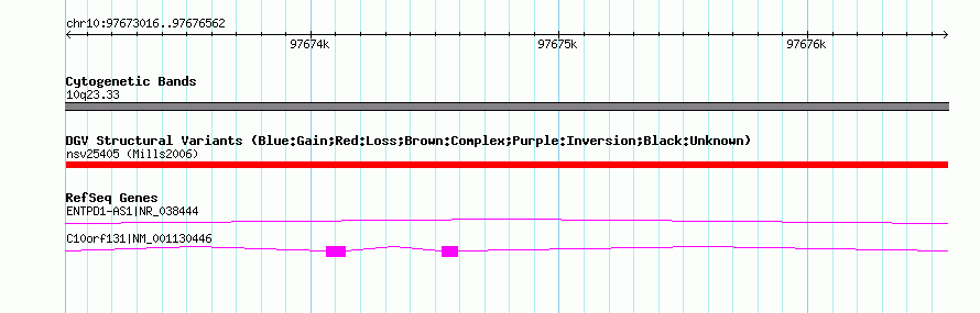 Variant DetailsVariant: nsv25405 | Internal ID | 16695944 | | Landmark | | | Location Information | | | Cytoband | 10q23.33 | | Allele length | | Assembly | Allele length | | hg38 | 3547 | | hg19 | 3547 | | hg18 | 3547 | | hg17 | 3547 |