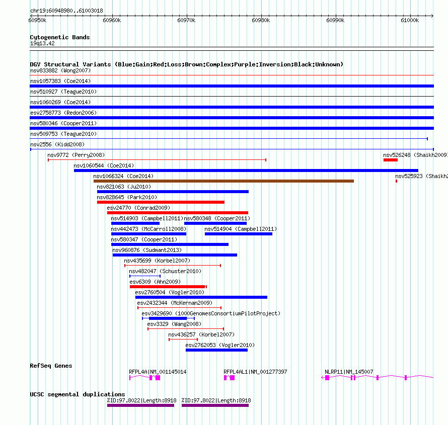 Variant DetailsVariant: nsv2556| Internal ID | 15200433 | | Landmark | | | Location Information | | | Cytoband | 19q13.42 | | Allele length | | Assembly | Allele length | | hg38 | 9648 | | hg19 | 9648 | | hg18 | 9648 | | hg17 | 9648 |