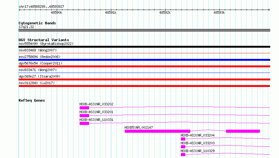 Variant DetailsVariant: nsv3112840| Internal ID | 21296106 | | Landmark | | | Location Information | | | Cytoband | 17q21.32 | | Allele length | | Assembly | Allele length | | hg38 | 4629 | | hg19 | 4629 |