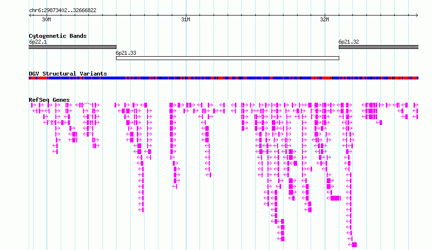 | | Variant Type | CNV deletion | | Copy Number | | | Allele State | | | Allele Origin | | | Probe Count | | | Validation Flag | | | Merged Status | M | | Merged Variants | dgv1019n145 | | Supporting Variants | nssv14082955, nssv14087599, nssv14086381 | | Samples | sample323, sample134, sample191 | | Known Genes | ABCF1, ABHD16A, AGER, AGPAT1, AIF1, APOM, ATAT1, ATF6B, ATP6V1G2, ATP6V1G2-DDX39B, BAG6, BTNL2, C2, C4A, C4B, C4B_2, C6orf10, C6orf136, C6orf15, C6orf25, C6orf47, C6orf48, CCHCR1, CDSN, CFB, CLIC1, CSNK2B, CYP21A1P, CYP21A2, DDAH2, DDR1, DDX39B, DHX16, DPCR1, DXO, EGFL8, EHMT2, FKBPL, FLOT1, GNL1, GPANK1, GPSM3, GTF2H4, HCG17, HCG18, HCG22, HCG23, HCG26, HCG27, HCG4B, HCG8, HCG9, HCP5, HLA-A, HLA-B, HLA-C, HLA-DQA1, HLA-DQB1, HLA-DRA, HLA-DRB1, HLA-DRB5, HLA-DRB6, HLA-E, HLA-H, HLA-J, HLA-L, HSPA1A, HSPA1B, HSPA1L, IER3, LOC100507547, LOC102060414, LSM2, LST1, LTA, LTB, LY6G5B, LY6G5C, LY6G6C, LY6G6D, LY6G6E, LY6G6F, MCCD1, MDC1, MICA, MICB, MIR1236, MIR4640, MIR4646, MIR6721, MIR6832, MIR6833, MIR6891, MIR877, MRPS18B, MSH5, MSH5-SAPCD1, MUC21, MUC22, NCR3, NELFE, NEU1, NFKBIL1, NOTCH4, NRM, PBX2, POU5F1, PPP1R10, PPP1R11, PPP1R18, PPT2, PPT2-EGFL8, PRR3, PRRC2A, PRRT1, PSORS1C1, PSORS1C2, PSORS1C3, RNF39, RNF5, RNF5P1, RPP21, SAPCD1, SFTA2, SKIV2L, SLC44A4, SNORA38, SNORD117, SNORD48, SNORD52, SNORD84, STK19, TCF19, TNF, TNXA, TNXB, TRIM10, TRIM15, TRIM26, TRIM31, TRIM39, TRIM39-RPP21, TRIM40, TUBB, VARS, VARS2, VWA7, ZBTB12, ZNRD1, ZNRD1-AS1 | | Method | Oligo aCGH | | Analysis | | | Platform | | | Comments | | | Reference | Lu_et_al_2017 | | Pubmed ID | 28705883 | | Accession Number(s) | nsv3116433