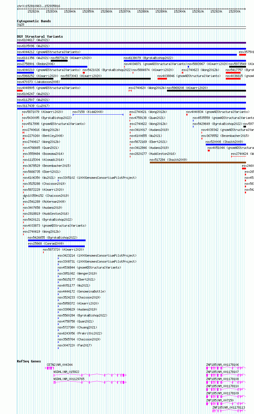 Variant DetailsVariant: nsv3117439| Internal ID | 21300705 | | Landmark | | | Location Information | | | Cytoband | Xq28 | | Allele length | | Assembly | Allele length | | hg38 | 124854 | | hg19 | 124866 |