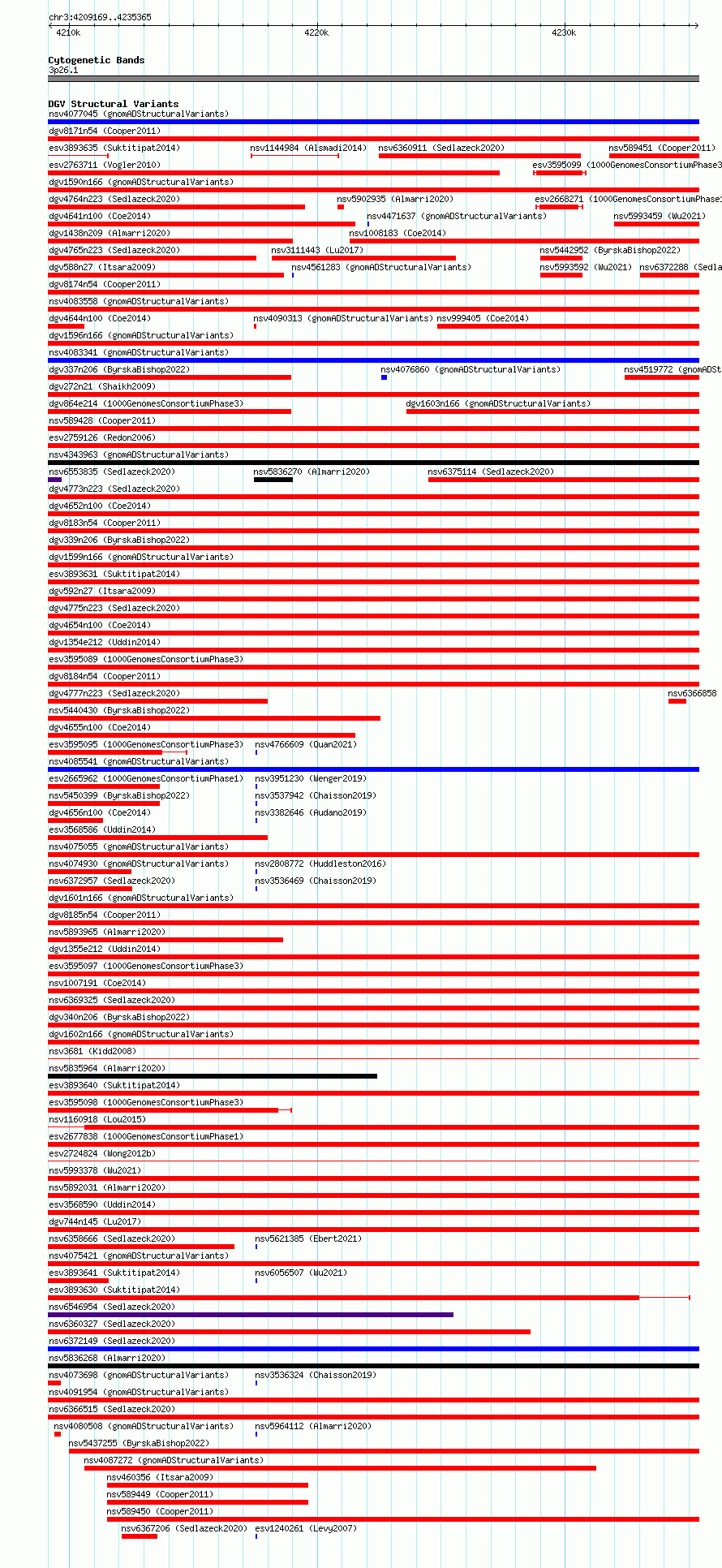 Variant DetailsVariant: nsv3117954| Internal ID | 21301220 | | Landmark | | | Location Information | | | Cytoband | 3p26.1 | | Allele length | | Assembly | Allele length | | hg38 | 26197 | | hg19 | 26197 |