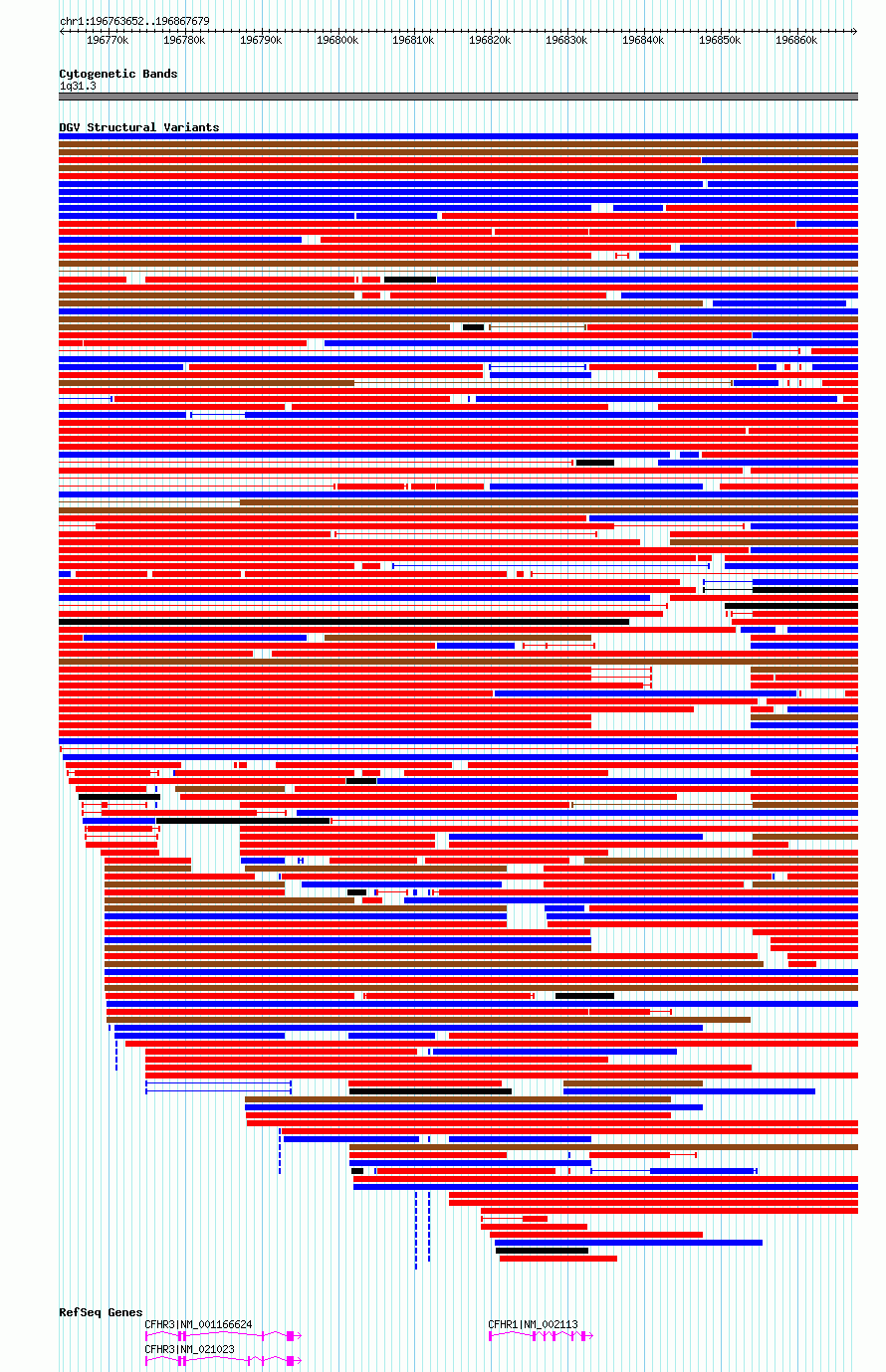 | | Variant Type | CNV deletion | | Copy Number | | | Allele State | | | Allele Origin | | | Probe Count | | | Validation Flag | | | Merged Status | M | | Merged Variants | | | Supporting Variants | nssv14254320 | | Samples | NA19239 | | Known Genes | CFHR1, CFHR3 | | Method | Optical mapping | | Analysis | BioNano Genomics proprietary analysis | | Platform | BioNano Genomics | | Comments | | | Reference | Chaisson_et_al_2019 | | Pubmed ID | 30992455 | | Accession Number(s) | nsv3209410