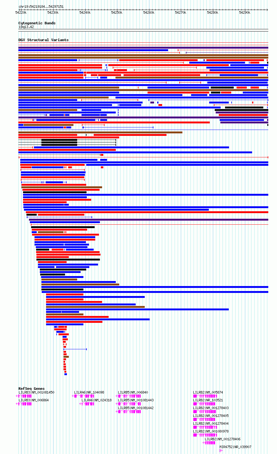 | | Variant Type | CNV deletion | | Copy Number | | | Allele State | | | Allele Origin | | | Probe Count | | | Validation Flag | | | Merged Status | M | | Merged Variants | | | Supporting Variants | nssv14263552, nssv14263553 | | Samples | NA19238, HG00513 | | Known Genes | LILRA3, LILRA6, LILRB2, LILRB3, LILRB5, MIR4752 | | Method | Optical mapping | | Analysis | BioNano Genomics proprietary analysis | | Platform | BioNano Genomics | | Comments | | | Reference | Chaisson_et_al_2019 | | Pubmed ID | 30992455 | | Accession Number(s) | nsv3229368