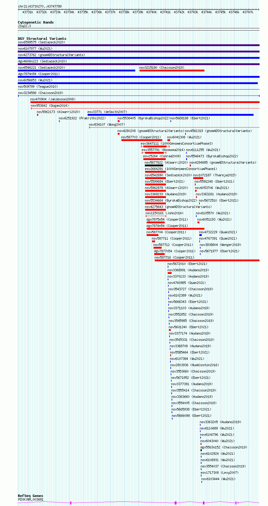 Variant DetailsVariant: nsv3234588| Internal ID | 22373077 | | Landmark | | | Location Information | | | Cytoband | 21q22.3 | | Allele length | | Assembly | Allele length | | hg38 | 399 | | hg19 | 399 |