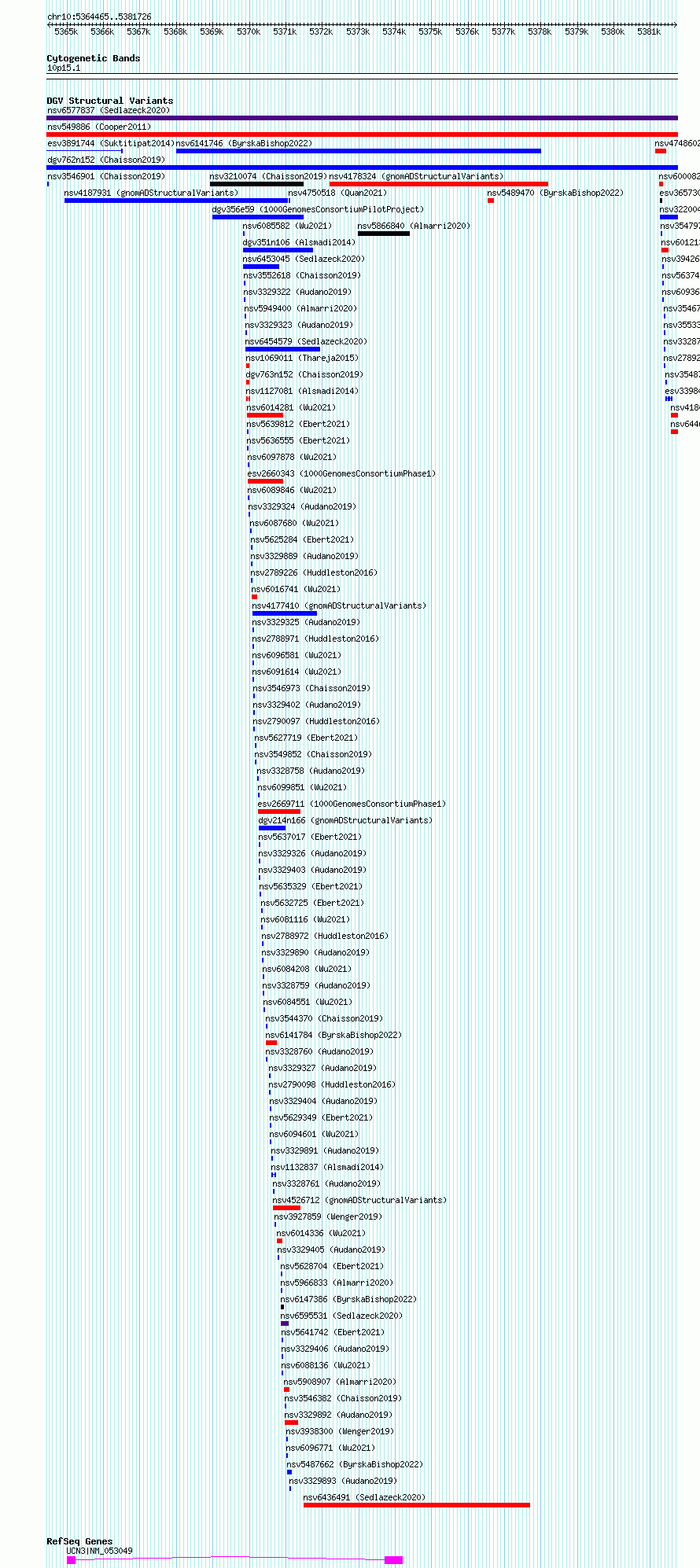 Variant DetailsVariant: nsv3247542| Internal ID | 22376747 | | Landmark | | | Location Information | | | Cytoband | 10p15.1 | | Allele length | | Assembly | Allele length | | hg38 | 1040 | | hg19 | 1040 |