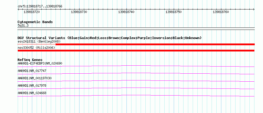 Variant DetailsVariant: nsv330052 | Internal ID | 17126233 | | Landmark | | | Location Information | | | Cytoband | 5q31.3 | | Allele length | | Assembly | Allele length | | hg38 | 50 | | hg19 | 50 | | hg18 | 50 | | hg17 | 50 |