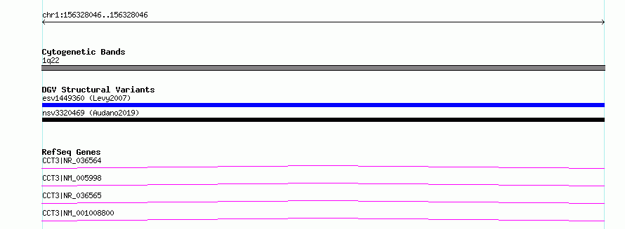 Variant DetailsVariant: nsv3320469 Internal ID | 19404760 | Landmark | | Location Information | | Cytoband | 1q22 | Allele length | Assembly | Allele length | hg38 | 142 | hg19 | 142 |