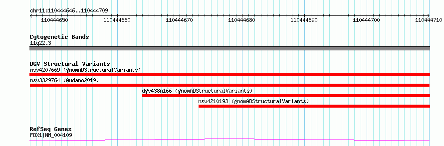 | Variant Type | CNV deletion | Copy Number | | Allele State | | Allele Origin | | Probe Count | | Validation Flag | | Merged Status | M | Merged Variants | | Supporting Variants | nssv14522314, nssv14512331 | Samples | NA12878, HG02059 | Known Genes | FDX1 | Method | Sequencing | Analysis | Read and contig alignments were done with BLASR. The Celera assembler (8.3rc2) was used to assemble RS II samples (CHM1, CHM13, HG00514, HG00733, NA19240, HG02818, NA19434, HG01352, HG02059, NA12878, and HG04217, and Canu (1.7) was used for Sequel samples (HG02106 and HG00268). Variant calling was performed with SMRT-SV (10.1101/gr.214007.116). | Platform | PacBio RS II P6C4, PacBio Sequel v2.1 | Comments | | Reference | Audano_et_al_2019 | Pubmed ID | 30661756 | Accession Number(s) | nsv3329764