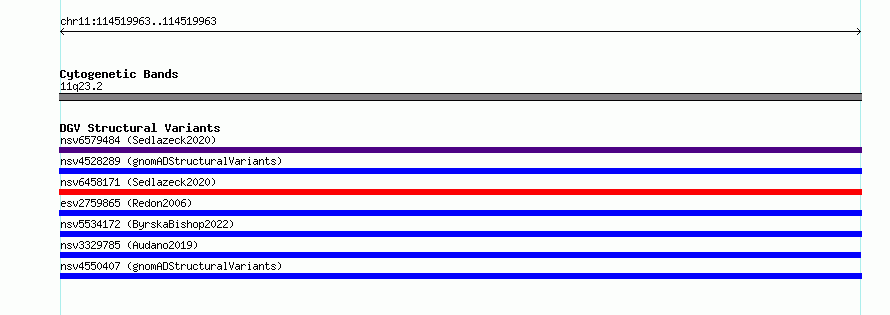 Variant DetailsVariant: nsv3329785| Internal ID | 19760763 | | Landmark | | | Location Information | | | Cytoband | 11q23.2 | | Allele length | | Assembly | Allele length | | hg38 | 79 | | hg19 | 79 |
