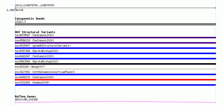 Variant DetailsVariant: nsv3331482| Internal ID | 19762460 | | Landmark | | | Location Information | | | Cytoband | 11q22.3 | | Allele length | | Assembly | Allele length | | hg38 | 129 | | hg19 | 129 |