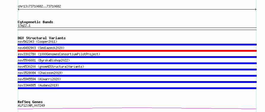 Variant DetailsVariant: nsv3344885| Internal ID | 19775863 | | Landmark | | | Location Information | | | Cytoband | 13q22.1 | | Allele length | | Assembly | Allele length | | hg38 | 167 | | hg19 | 167 |