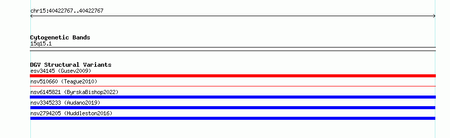 Variant DetailsVariant: nsv3345233 | Internal ID | 19776211 | | Landmark | | | Location Information | | | Cytoband | 15q15.1 | | Allele length | | Assembly | Allele length | | hg38 | 183 | | hg19 | 183 |