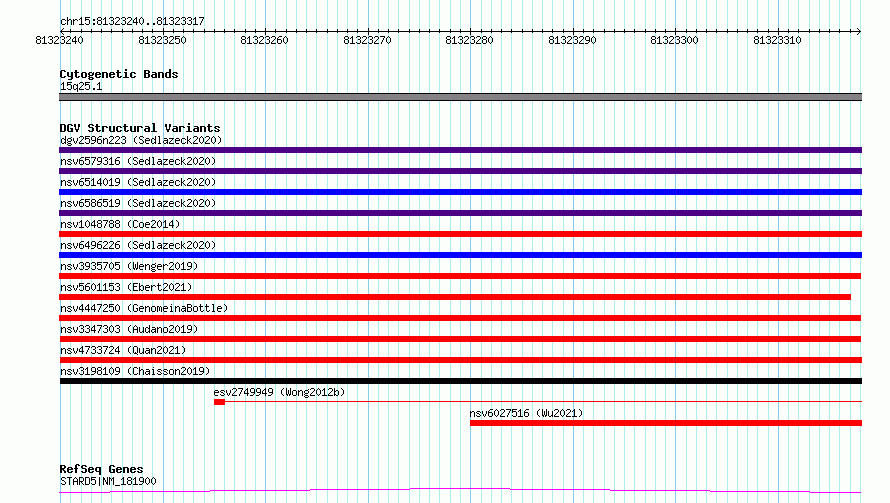 Variant DetailsVariant: nsv3347303| Internal ID | 19778281 | | Landmark | | | Location Information | | | Cytoband | 15q25.1 | | Allele length | | Assembly | Allele length | | hg38 | 78 | | hg19 | 78 |