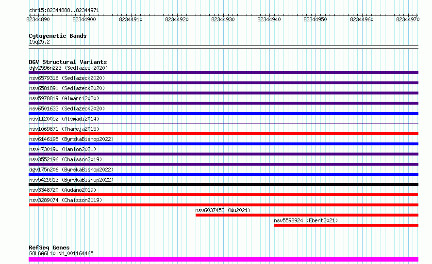 Variant DetailsVariant: nsv3348720| Internal ID | 19779698 | | Landmark | | | Location Information | | | Cytoband | 15q25.2 | | Allele length | | Assembly | Allele length | | hg38 | 84 | | hg19 | 84 |