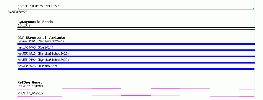 Variant DetailsVariant: nsv3356076| Internal ID | 19787054 | | Landmark | | | Location Information | | | Cytoband | 13q13.2 | | Allele length | | Assembly | Allele length | | hg38 | 80 | | hg19 | 80 |