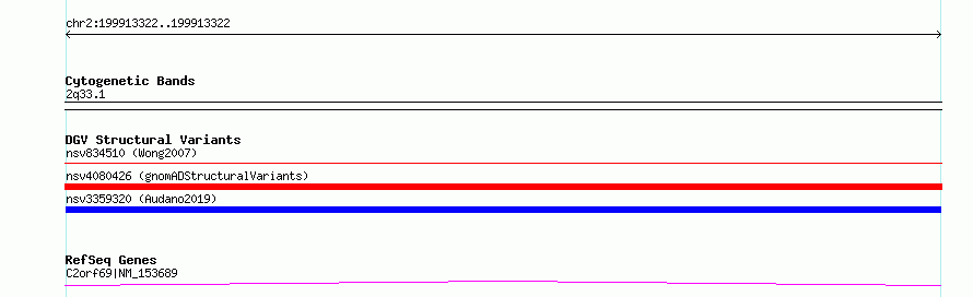 Variant DetailsVariant: nsv3359320| Internal ID | 19443612 | | Landmark | | | Location Information | | | Cytoband | 2q33.1 | | Allele length | | Assembly | Allele length | | hg38 | 66 | | hg19 | 66 |