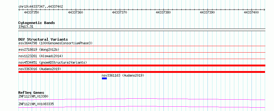 Variant DetailsVariant: nsv3363016| Internal ID | 19447308 | | Landmark | | | Location Information | | | Cytoband | 19q13.31 | | Allele length | | Assembly | Allele length | | hg38 | 56 | | hg19 | 56 |