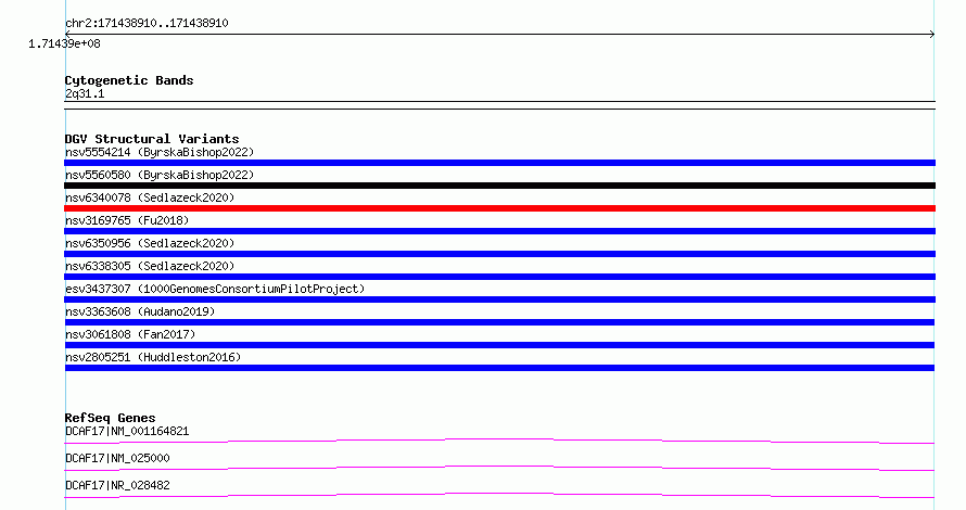 Variant DetailsVariant: nsv3363608| Internal ID | 19794586 | | Landmark | | | Location Information | | | Cytoband | 2q31.1 | | Allele length | | Assembly | Allele length | | hg38 | 103 | | hg19 | 103 |